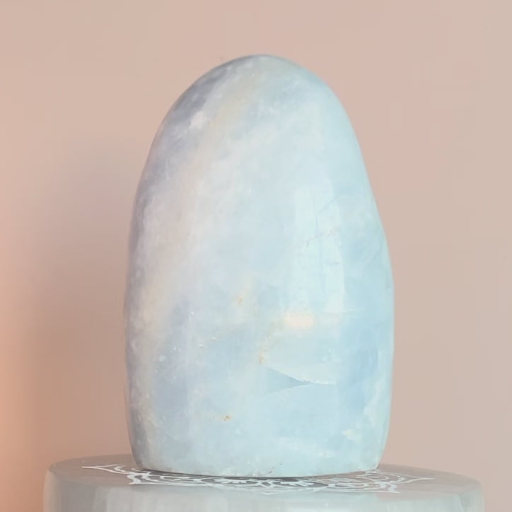 La Calcita Azul es conocida por su energía calmante y ordenadora. Ayuda a aquietar pensamientos repetitivos, suavizar emociones intensas y favorecer una comunicación más serena, empezando por la que mantienes contigo misma. En este monolito, esa energía se percibe estable y continua, ideal para momentos en los que necesitas silencio mental, claridad emocional o simplemente sentirte sostenida.